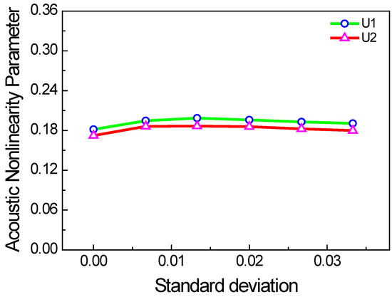 The lengths of each micro-crack in practice should be different. Thus, we also consider the two cases with the crack length of uniform and Gaussian random distributions. In the two cases, the mean values are the same, but the standard deviations are changed. Figure 10 and Figure 11 show the acoustic nonlinearity parameter versus the standard deviation of micro-crack lengths. It is shown that the acoustic nonlinearity parameter does not change with standard deviation, which is only related to the mean value.