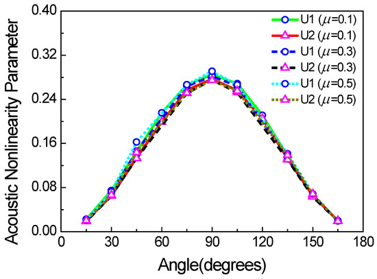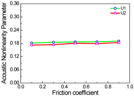 The above cases are all based on the assumption that crack angles have a uniform and random distribution with a range from 0° to 180° (the angle between the crack face and the x direction). However, the angles of micro-cracks [22,23] can affect the acoustic nonlinearity parameter. In this case, we consider that all the micro-crack angles are uniform, and the positions of micro-cracks are also of a uniformly random distribution. The acoustic nonlinearity parameter is shown as a function of the angle of micro-cracks in Figure 15. When the angle is 90°, the acoustic nonlinearity parameter is at the maximum, which is essentially caused by the considerable clapping behavior of the cracks rather than the frictional one. Meanwhile, we also find that the friction coefficient slightly affects the acoustic nonlinearity parameter under the condition of regularly arranged micro-cracks. The reason could be the weak energies of Rayleigh waves, which hardly generate the slipping trend between the surfaces of micro-cracks. Therefore, we can also infer that the clapping behavior is of more importance than the frictional one under the condition of regularly arranged micro-cracks.