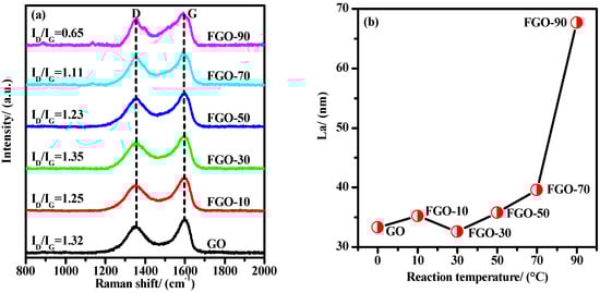 Furthermore, it has been empirically found that the disorder decreases the sp2 plane domain (La) in product structures [33].The La value can be obtained with the formula of La = (2.4 × 10−10) × λ4laser (ID/IG)−1, where λlaser is the excitation wavelength [34]. As shown in Figure 2b, compared to GO, the La value of FGO-T generally increased, indicating that addition of PPD molecules increased the order and the sp2 plane in GO was restored gradually. Moreover, from 10~70 °C, the change in La values was relatively small, while over 70 °C, the change in La was the largest. This indicated that elevated temperature could promote the amidation reactions, and the optimum temperature for amidation reaction should be above 70 °C [35].