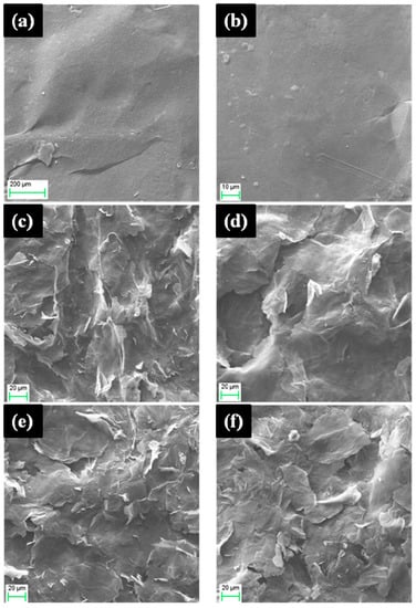 The morphologies of GO and FGO-T (T = 10, 50, 70, and 90) are shown in Figure 3. The most significant difference between GO and FGO-T is their surface roughness. The GO surface appeared flat and smooth (Figure 3a,b). However, as shown in Figure 3c–f, when the GO interacted with PPD, the surface of FGO-T films became rough. PPD is a rigid structure and acts as a nanospace barrier, blocking the stacking of GO sheets. Therefore, the surface of FGO became rough and showed more cracks. The surface roughness was similar to that reported by Shanmugharaj et al. [23] for composites which were prepared by the reaction between GO and alkylamines of varying chain lengths. However, the effect of temperature on surface roughness was less than that of chain lengths. As the temperature increased, the surface roughness of FGO-T films became smaller. This can be attributed to the fact that the elevated temperature promoted amidation reactions instead of adsorption.