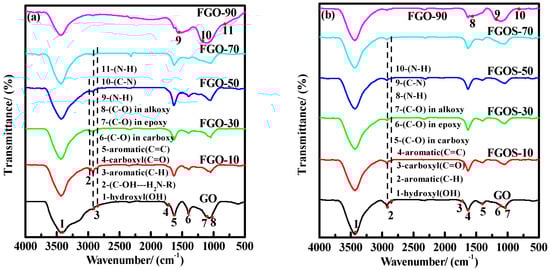 To further confirm the above hypothesis, FT-IR analysis of FGOS-T was performed and the results are presented in Figure 4b. Compared to Figure 4a, the absorption peaks of FGO-T (T = 10, 30, 50, 70) at 833 and 2982 cm−1 vanished. These peaks were ascribed to N–H bending vibration with hydrogen bonding between –NH2 in PPD and the oxygen-containing group of GO, respectively. The absorption peaks of FGOS-90 at 1583, 1176 and 834 cm−1 attributed to N–H stretching vibration, C–N stretching vibration and N–H bending vibration, respectively, were consistent with those observed for FGO-90. In addition, compared to GO, the absorption peaks caused by O–C=O and C–O–C stretching vibrations vanished from the spectra. Therefore, it can be concluded that from 10~70 °C, PPD monomer interacted with GO through non-covalent hydrogen and ionic bonds. After soaking in methyl alcohol, the physical adsorptions in PPD were removed. At 90 °C, PPD monomer covalently reacted with GO, resulting in a C–N covalent bond that was still intact after being soaked in methyl alcohol.