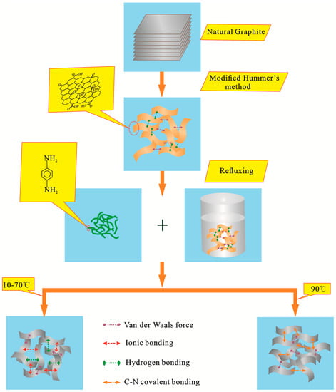 Therefore, according to SEM analyses, the type of bond that would allow the PPD monomer to attach onto GO at temperatures from 10~70 °C can only be based on physical adsorption: (I) hydrogen-bond (C–OH…H2N–X) between oxygen-containing group of GO and NH2 group of PPD molecule, and (II) ionic bond (–COO−H3+N–R) between protonated PPD and weakly acidic GO. However, above 90 °C, NH2 in PPD reacted with the oxygen-containing group of GO, resulting in C–N bond (Figure 5).