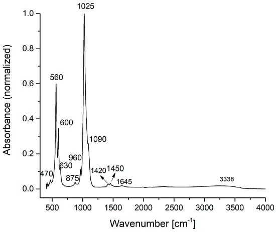 In the IR absorption spectrum from Figure 2, the main characteristic vibrational bands of the HAp nanoparticles can be identified. The spectrum was normalized from 0 to 1 using the SPECTRUM software of the Perkin Elmer SP 100 spectrometer. The fundamental vibrational modes of [PO4]3− groups of the apatitic structure appear at 470 cm−1 (ν1), 560, 600, 630 cm−1 (ν4), 960 cm−1 (ν1), 1025, 1090 cm−1 (ν3) [,]. The IR bands from 875, 1420, 1450 cm−1 can be attributed to the vibrations of the [CO3]2− carbonate group []. The [CO3]2− group absorption band presence in the HAp IR spectrum was due to the formation of carbonated groups in the HAp powder during the chemical synthesis. The weak and broad IR bands from 1645 and 3338 cm−1 characterize the O–H vibration from the water absorbed into the HAp structure.