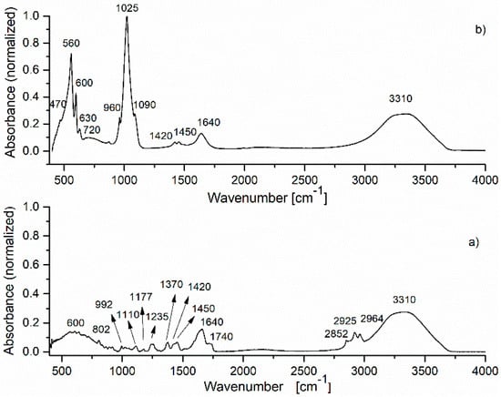 The spectrum of the HAp-B sample was dominated by the IR bands specific to HAp. The IR spectral absorption bands of basil EO were usually present in the 2700–3200 cm−1 and 600–1850 cm−1 spectral regions. As the 600–1850 cm−1 spectral range was mainly dominated by the IR bands characteristic to HAp, only a few IR bands specific to basil oil were indicated in the HAp-B absorption spectrum shown in Figure 3 and subsequently in Table 2, like 720 cm−1 (C–H vibrations), 1640 cm−1 (O–H vibrations) respectively 3310 cm−1 (O–H vibrations). The broad IR band from 720 cm−1 observed in Figure 3a appears to be due to the overlapping of the basil EO absorption bands in the 600–800 cm−1 spectral region.