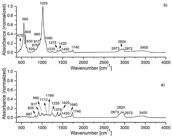 The IR spectra of lavender EO and HAp-L samples are presented in Figure 4. The IR spectrum in Figure 4a reveals the characteristic IR absorption bands of lavender EO [,]. In the spectral region of 2800–3400 cm−1, the IR peaks at 2873, 2924, 2972 cm−1 were ascribed to –CH2 stretching, while the band at 3400 cm−1 was attributed to O–H stretching vibrations. The most intense IR band in the spectrum appears at 1740 cm−1 (C=O stretching vibrations). The 1640 cm−1 IR band belongs to the C=C stretching vibration. In the 400–1500 cm−1 region, the following IR peaks were identified: 687, 835, 917 cm−1 (C–H vibrations), 990 cm−1 (–CH2 vibrations), 1112, 1168, 1235 cm−1 (C–O stretching vibrations), 1375, 1420, 1450 cm−1 (C–H bending vibrations) [].