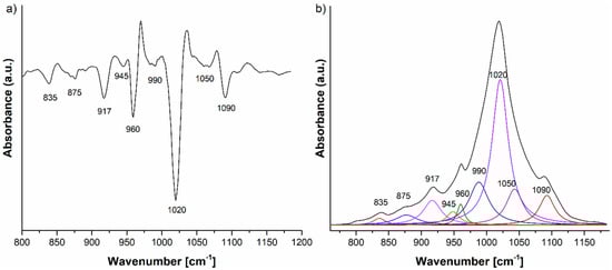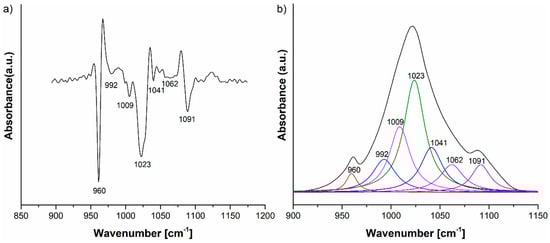 (a) Second derivative and (b) FTIR deconvoluted spectra of the HAp-B IR spectrum in the 800–1200 cm−1 domain.