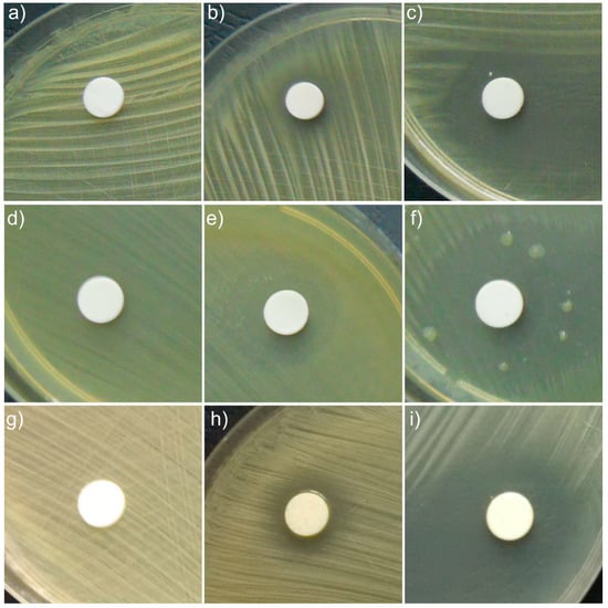 Qualitative assay of the inhibitory activity of HAp, HAp-B and HAp-L samples against MRSA (a–c), E. coli ATCC 25922 (d–f) and S. aureus 0364 (g–i) bacterial strains.