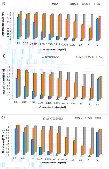 The effect of nanopowders of HAp-B and HAp-L on cell viability was appraised on different Gram-positive (MRSA and S. aureus) and Gram-negative (E. coli) bacteria (Figure 8a–c). The effects of the HAp-B and HAp-L samples tested against MRSA cell growths at different concentrations from 0.01 to 5 mg/mL are presented in Figure 8a. For HAp-L the growth of MRSA cell was diminished at concentrations greater than 0.02 mg/mL. A slow decrease in MRSA cell growth was observed for HAp-B samples. HAp-B leads to a decrease in MRSA cell growth at concentrations greater than 0.625 mg/mL. It was noticed that at concentrations lower than 0.625 mg/mL, HAp-B did not have any effect on the inhibition of MRSA cell growth. An evolution of S. aureus cell growth in the presence of the HAp-B and HAp-L was also monitored (Figure 8b). Impaired cell growth of S. aureus was observed at concentrations between 0.313 and 5 mg/mL for the HAp-B sample. Likewise, a decrease in cell growth of S. aureus was observed, starting at the lowest concentration (0.01 mg/mL), in the presence of the HAp-B sample. Additionally, the inhibitory effect of the HAp-B and HAp-L was also evaluated against E. coli bacterial cells (Figure 8c). The HAp-L inhibited the E. coli growth starting with a concentration equal to 0.02 mg/mL while the HAp-B inhibited the E. coli growth starting with a concentration equal to 0.078 mg/mL.