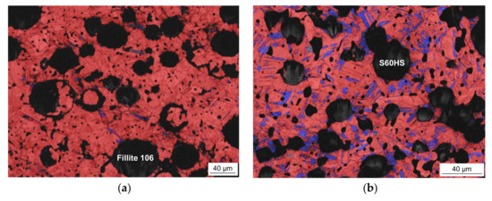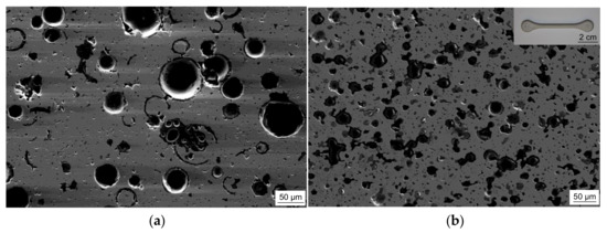 The microstructures of the sintered syntactic TRIP-steel matrix foams either containing cenospheres or glass microspheres are different. In both cases, the second component is well-dispersed within the metal matrix also containing some residual sinter porosity. As shown in Figure 1a, exemplarily for the material with 40 vol % Fillite 106, the intact cenospheres exhibit a high sphericity and a high effective pore volume. As comparable to previous investigations on Invar-based syntactic foams [43], cenospheres that are broken and/or filled by the matrix material during the synthesis process can be detected. In the case of the congeneric TRIP-steel/S60HS foams, the microspheres are less regular in shape and more clustered (see Figure 1b).