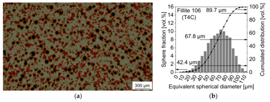 Tomographic imaging of the syntactic TRIP steel matrix foam with 40 vol % Fillite 106: (a) reconstructed 2D image (pale grey—matrix, cenospheres: red—solid part, black—cavities/pores); (b) sphere size distribution (using equivalent spherical diameter, ESD).