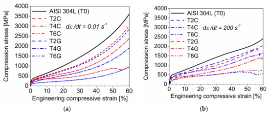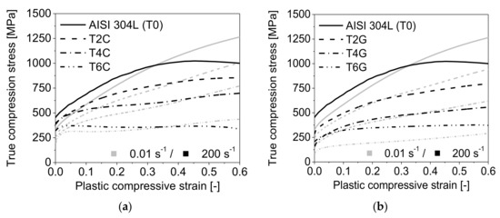 The significant decrease of the strain hardening rate when exceeding a certain plastic deformation degree can be attributed to two factors: the quasi-adiabatic heating of the specimen due to the resulting deformation heat which remains to a great magnitude (~95%) in the steel matrix and the strain rate decline during the drop weight impact test. In agreement with previous findings [32,33,46], the deformation temperature in cellular austenitic stainless steel structures being subject to strain rates of 102–103 s−1 can go up to 100 °C (or temperature gradient of ~80 K) or even higher when the failure is localized in shear bands [66]. Batches with higher density as the reference T0 exhibit higher deformation stresses and, hence, higher deformation work. On the other hand their thermal mass is also higher. Therefore, adiabatic softening effects should be perceptible for all tested materials. Indeed, for all batches with the exception of T6G the curves for the true stress for high-rate compression drop below those of the corresponding quasi-static tests. Furthermore, the relation of the true quasi-static and dynamic compression stresses at a strain of 0.6 is between 1.2 and 1.3 for all batches.