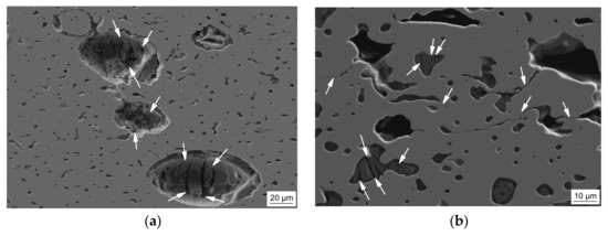 Due to shell fracture/fragmentation the cenospheres lose their initial integrity (Figure 8a), are closed and transform into an elliptical shape (Figure 8b). Finally, the barreling and densification of the T2C, T4C and T6C samples are accompanied by a rearrangement and alignment of collapsed cenospheres to chain-like clusters (“lateral extrusion” [45]) within the shear-cross region (Figure 8c).