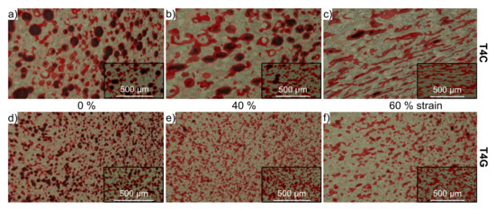 The structural evolution of the glass-containing syntactic foams is more difficult to comprehend since only a small quantity of more or less regular spheres remained after processing (Figure 8d). These spheres are closed during plastic deformation of the sample and form finally irregular clusters or agglomerates with the neighboring inclusions (Figure 8e). A preferred orientation or even an alignment of those clusters during densification could not be proven (Figure 8f). However, a further failure mechanism, which is more pronounced for the T2G, T4G and T6G materials, is the crack propagation and crack branching through matrix ligaments originating from the glassy clusters and inclusions, as denoted in Figure 7b.