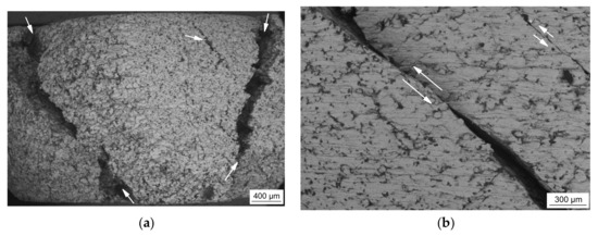 Consistently, the degree of damage is enhanced and the failure is accelerated with increasing volume content of the secondary component within the steel matrix and with increasing strain rate. Hence, macro cracks originating from the free outer surface of the specimens could be detected (Figure 9a). Moreover, the formation of macro shear zones within the sample was more dominant in materials being subjected to dynamic impact loading in the drop weight tower (Figure 9b).