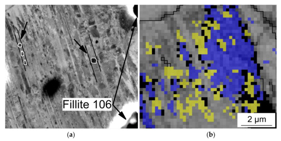 (a) BSE image (arrows indicate -martensite within deformation bands) and (b) EBSD phase map of the syntactic foam with 20 vol % Fillite 106 after 20% quasi-static deformation; for EBSD: grey—band contrast of austenite, yellow—-martensite, blue—-martensite, black dots—not indexed, black line—High Angle Grain Boundaries (HAGBs), coincidence site lattice CSL boundaries.