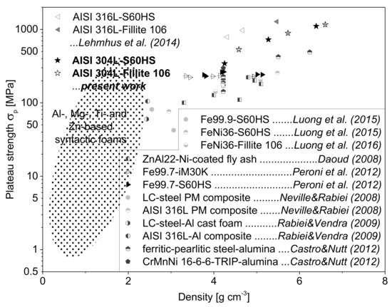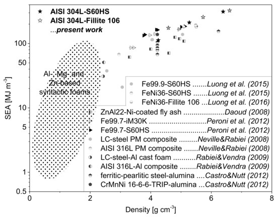 The property charts in Figure 15 and Figure 16 give an evaluation of the plateau strength and specific energy absorption (SEA, in MJ/m3) of the presently studied syntactic foams in comparison with corresponding results for other types of MMSFs. The plateau strengths of the AISI 304L-SFs are lower than the values obtained for the AISI 316L-based variants (without TRIP effect) which were subject to the same conditions of the MIM process, volume contents and types of spheres [29]. This fact can be mainly attributed to the higher basic strength of the AISI 316L-steel matrix (, [29]) as compared to the AISI 304L bulk material (, [5]) determined by quasi-static tensile tests. However, in general the materials with strain hardening austenitic stainless steel matrices surpass the common Al-, Mg-, Ti-, Zn-, Invar- and pure Fe-based syntactic foams [1,8,12,16,22,28,43,51,52,53,54,55,56,57,58,59,60,61,62] as well as other steel composite foams [18,63,64].
