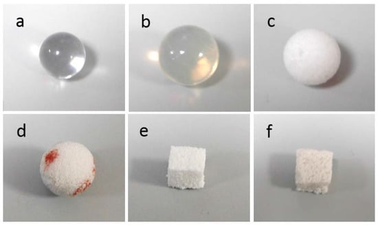 Pictures of the samples analyzed in this work: (a) non-porous PMMA; (b) non-porous silicone; (c) porous PE; (d) porous alumina (red pen marks were done as reference positions to make it easier to find the struts and land onto them with the atomic force microscope (AFM) probe tip, instead of sinking into the macropores); (e) porous GCA; (f) porous GCB. Implant dimensions are summarized in Table 1.