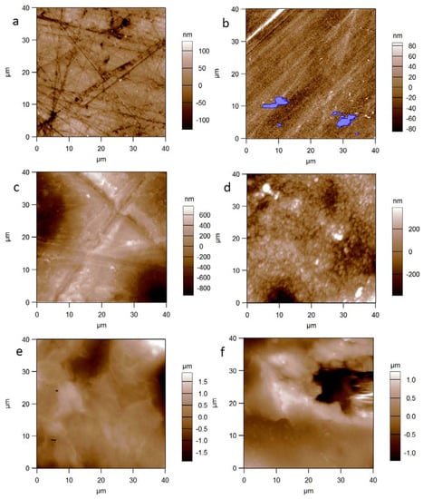 Representative topographic images of the materials’ surfaces: (a) PMMA; (b) silicone; (c) PE; (d) alumina; (e) GCA; (f) GCB.
