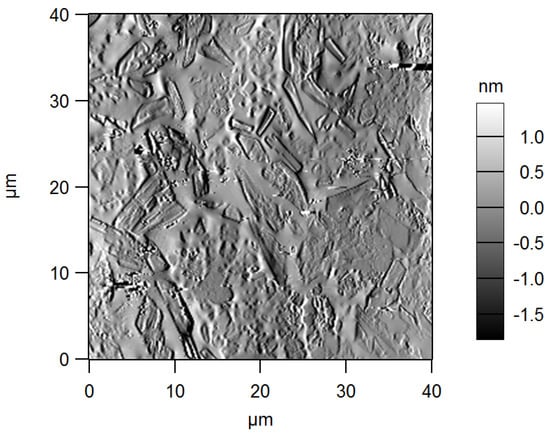 The AFM also allowed us to visualize the glass-ceramic nature of GCA thanks to the images of cantilever oscillation amplitude, which is the error signal to be cancelled out in the AFM feedback circuit. This signal is sensitive to tiny local deviations in morphology, and in fact it can capture fine details, with a resulting rendering similar to that of a grazing angle topographic image. As an example, Figure 4 shows an image of mean amplitude—that is, (trace scan amplitude + retrace scan amplitude)/2—acquired simultaneously with the height image of Figure 3e. Clearly, the edges of regular polygonal wollastonite crystals embedded in an amorphous matrix of residual glass were detected, in agreement with X-ray diffraction analysis and SEM investigation reported in a previous work [].