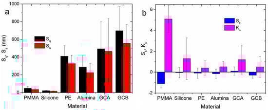 We now turn to the considerations about skewness and kurtosis. It should be reminded here that the use of these surface height parameters, in addition to more standard roughness parameters [], has already demonstrated to provide useful insights for a number of different materials, such as dental restorative resins [,] and composite coatings []. In this work, due to the broad scattering between different samples’ areas, no difference appears to be statistically significant. Nevertheless, when looking at the ranking of the means, one can observe that PMMA had the most negative mean for Sk, suggesting that the dominating features were the valley-type scratches, which are also present in alumina, GCB, and PE implants, but to a lesser extent. At the same time, Ku was less than three for all samples except for PMMA (again), meaning that those dominating scratches are quite sharp in shape. Overall, silicone thus emerges as the smoothest material in the broadest sense, more than PMMA even if similar when limiting the analysis to Sq only. From the viewpoint of the skewness, GCB shows also promise: in fact, exposing a predominance of valleys instead of peaks is expected to reduce the risk of conjunctival abrasion as the orbital implant moves.