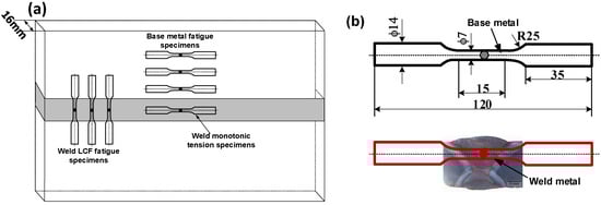 (a) Orientation of monotonic tension and fatigue test specimens with respect to the welded joints; (b) Schematic of LCF test specimens about base metal and weld metal.