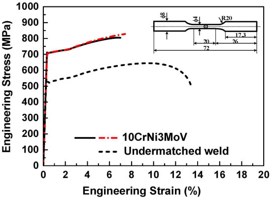 Monotonic stress-strain curves of 10CrNi3Mov high strength steel and its undermatched welds.