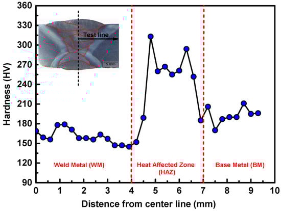 Figure 4 depicts the Vickers microhardness profile of the undermatched welded joint. The average hardness of BM and WM was about 200 and 160 HV, respectively. The hardness of HAZ was distributed from 315 to 270 HV. According to the hardness distribution of welded joints, it shows that fusion region (weld metal) is the weakest zone of the whole joint.