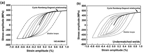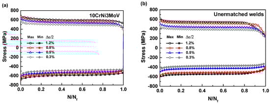 The influence of total strain amplitudes on cyclic stress response (Maximum stress and Minimum stress) against normalized life ratio of 10CrNi3MoV steel and its undermatched welds are depicted in Figure 5a,b, respectively. Regardless of the strain amplitude, the obvious cyclic strain-softening behaviors can be observed from the base metal and undermatched weld metal plots. As can be seen from these figures, the cyclic stress variation composes a rapid initial softening at the beginning 5–15% cyclic stage. Then keeps stable stress responses until 90–95% of life ratio and experiences a rapid drop in stress culminating in fatigue failure finally. Therefore, the stable stress and strain magnitudes at half-life can be used to assess the fatigue behavior of materials. These results further illustrate the effectiveness of parameters from stabilized half-life cyclic stress-strain hysteresis loops. Since the lower cycle strength of undermatched welds than base metal, the cycle stress responses also exhibit the corresponding decreasing under the same strain amplitudes. The softening behaviors of these materials verified the empirical rule proposed in [], in which metals with demonstrated cyclically soften (10CrNi3MoV steel and undermatched welds ). Additionally, the degree of softening is decreased with the increases of strain amplitudes.