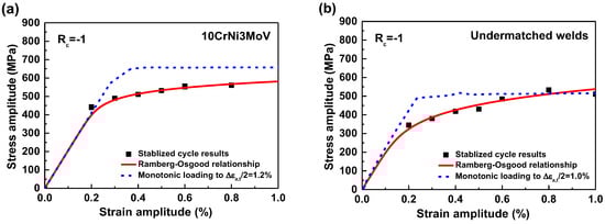 Stress-strain comparison between monotonic tension and cycle Ramberg-Osgood relationships: (a) 10CrNi3MoV steel; (b) Undermatched welds.