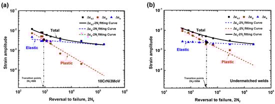 Manson-Coffin curves of test materials: (a) 10CrNi3MoV steel; (b) Undermatched welds.