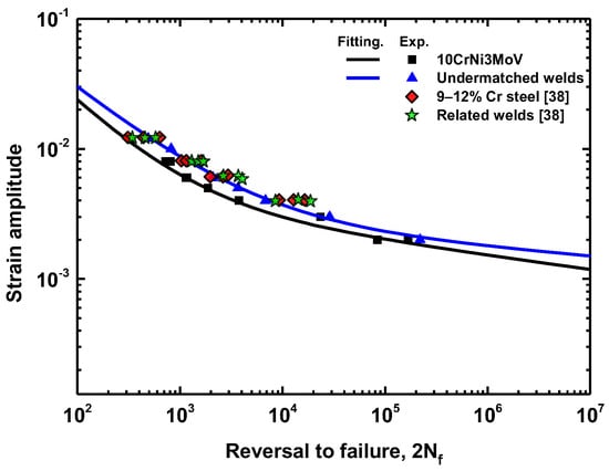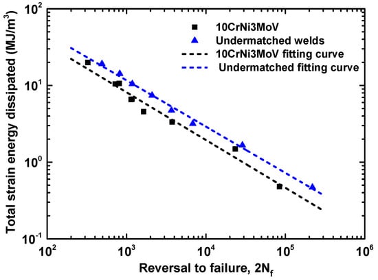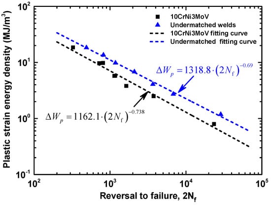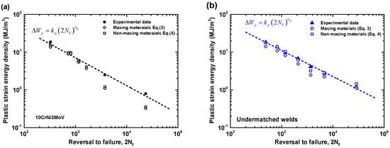In general, the Masing-type Equation (3) for plastic strain energy density is more suitable for the perfect Masing material, such as the base metal 10CrNi3MoV steel. Whereas the predicted Equation (4) for non-Masing material appear to be much accurate than Masing-type Equation (3). A compared summary of experimental data and predicted equations is presented in Table 7. The results are also shown in Figure 14. As can be seen from Figure 14a, the results from predicted equations for 10CrNi3MoV steel are close to the experimental data for high plastic strain energy density. While some deviation appears compared with experimental data in the range of small plastic strain energy density amplitudes. Nevertheless, the results from Masing-assumption model and non-Masing-assumption model are consistency for all the range of plastic strain energy density. Figure 14b shows the comparison of predicted models and experimental data for undermatched welds that reflects a typical non-Masing material behavior. From the results of comparison, the non-Masing material equation is more accurate than the Masing material equation for the weld metal, yet there are close to experimental data.