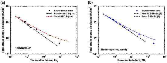The total strain energy density against the number of reversals to failure for base metal and its undermatched welds are compared in Figure 14. The difference of fatigue behaviors under different total strain energy density amplitudes between the two materials is obvious. Similar with the fatigue assessment of plastic strain energy density, the undermatched weld metal demonstrates better fatigue properties than base metal, even though the cyclic strength of weld metal is lower than base metal. Figure 15 depicts the comparison of total strain energy density based on Equations (8) and (9) for the two materials. The fitting function of Equation (9) has shown good agreement with the experimental observations. Moreover, it is not only suitable for low cycle fatigue but for high cycle fatigue, even can illustrate the mean stress effect. For some complicated components, such as notch components, it has more widely used to assess the fatigue behavior considering stress concentration phenomenon.