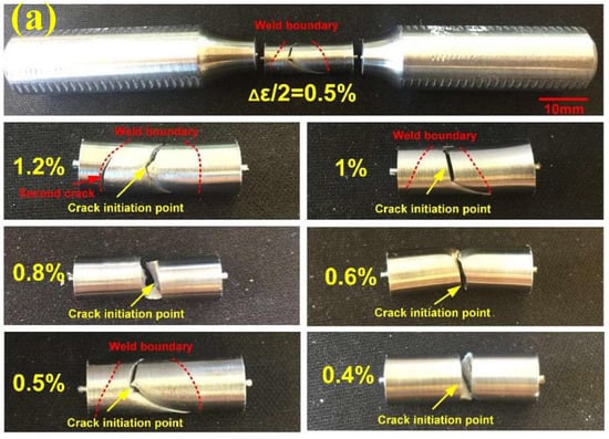 Since displacement-controlled loading was used for fatigue tests, different peak tensile stresses were observed for weldments and base metal under the same strain amplitude. Due to the lower fatigue strength and fatigue ductility coefficient of the undermatched welds, it is more likely that plastic deformation occurs in these samples. Thus, the final fatigue damage of welds is larger than that of base metal. When the location of fatigue crack initiation is determined, the fatigue life is dependent on the material properties.