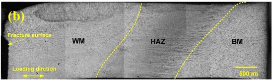 Due to the discrepancy of the chemical composition and microstructures between the base metal and undermatched weld metal, it is necessary to confirm the fracture location of the undermatched welded joints under low cycle fatigue. It can be seen for all strain amplitudes from Figure 15, the fracture crack is initiated from the undermatched weld metal. During the LCF tests, the strain of the welded joints mainly concentrated on the weld metal (WM) region. Especially at the large strain amplitude (1.2%) from Figure 15a, obvious plastic deformation can be observed in WM region. Although it occurs secondary crack in the HAZ, the final fracture position appears in the weld metal. To further verify fatigue failure locations in low cycle fatigue tested specimens of weld joints, optical metallographic studies had been carried out on longitudinal cross section of the fatigue tested sample (Δε/2 = 0.6%) in Figure 15b. It can be observed from this figure, the fatigue crack was initiated and propagated in the WM region. It demonstrates again that the weakest region is the weld metal zone.