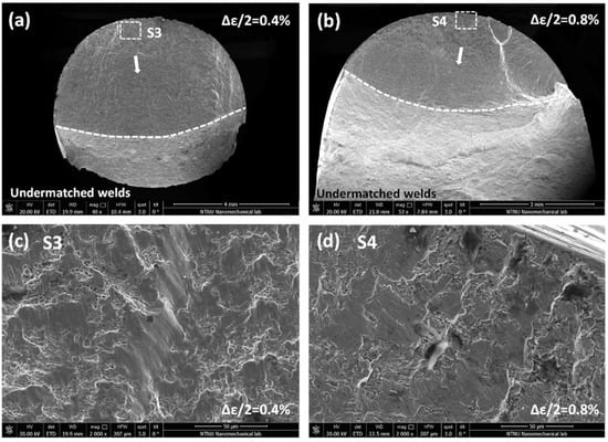 SEM fracture images, under strain amplitudes 0.4% and 0.8% of undermatched welds. (a) over fracture surface under 0.4%; (b) over fracture surface under 0.8%; (c) crack propagation near crack origin under 0.4%; (d) crack origin under 0.8%.