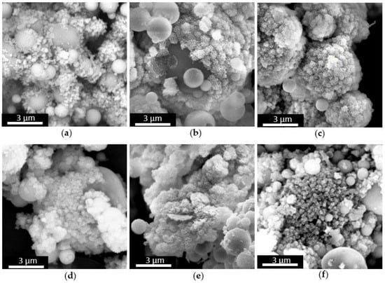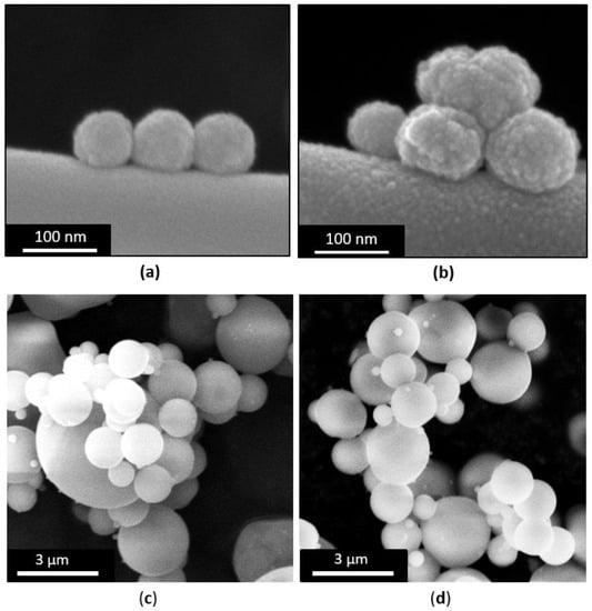 FE-SEM images (Figure 1a,b) of MBG_Sr2%_SG and MBG_Sr4%_SG revealed particles with uniform spherical morphology and size ranging between 100 and 200 nm. At variance, spray-dried samples (Figure 1c,d) were spherical particles with micrometric size between 0.5 and 5 µm, in analogy with those obtained in previous works [,]. Morphological analysis evidenced that for both methods the introduction of higher amount of strontium precursor did not lead to significant morphological variations of the final particles.