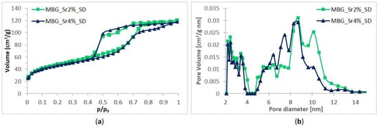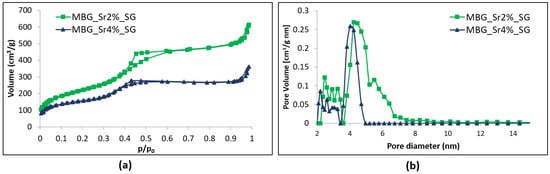 Nitrogen adsorption-desorption isotherms (Figure 2a) of MBG_Sr2%_SG and MBG_Sr4%_SG samples are both classified as type IV isotherms, conventionally associated with mesoporous materials, with H2 hysteresis loop. Pore size distributions of both samples showed uniform mesopores with a mean diameter of about 4 nm (Figure 2b). The increase of Sr molar concentration from 2 to 4 mol % led to a decrease in the specific surface area (SSA) from 803 to 551 m2·g−1 and of the pore volume from 0.82 to 0.45 cm3·g−1 []. In the literature, other works have shown that the incorporation of increasing amount of strontium, or trivalent element as Ce, into the framework of MBGs, affected their structural features [,,], leading to a reduction of specific surface area and pore volume, associated to the appearance of disorganized non-porous domains [].