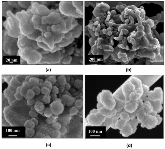 FE-SEM images of (a) MBG_Sr2%_SG; (b) MBG_Sr4%_SG; (c) MBG_Sr2%_SD; (d) MBG_Sr4%_SD.