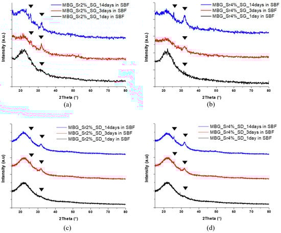XRD spectra after different time of soaking in SBF of: (a) MBG_Sr2%_SG; (b) MBG_Sr4%_SG; (c) MBG_Sr2%_SD; (d) MBG_Sr4%_SD.