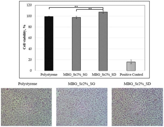 Section above: quantification of cell viability through MTT assay for MBG_Sr2%_ SG and MBG_ Sr2%_SD compared with polystyrene (negative control) and positive control (polystyrene with 0.08 µg/mL of NPS). (** p ≤ 0.01). Section below: optical images of cells after 72 h of incubation with MBG_Sr2%_ SG and MBG_ Sr2%_SD at concentration of 1 mg/1 mL, compared to cells seeded on polystyrene plate.