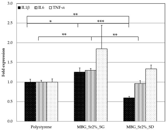 Gene expression of macrophages after 4 h of cell culture in direct contact with MBG_Sr2%_SD and MBG_Sr2%_SG. Fold expression of cytokines IL1β, IL 6 and TNFα. (* p < 0.05, ** p < 0.01 and *** p < 0.001).