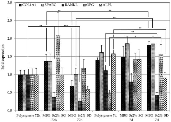 The expression level of the COL1A1, SPARC, RANKL, OPG and ALPL genes of osteoblast-like cells (SAOS2) analyzed by qRT-PCR at 72 h and at 7 days (* p ≤ 0.05, ** p ≤ 0.01 and *** p ≤ 0.001).