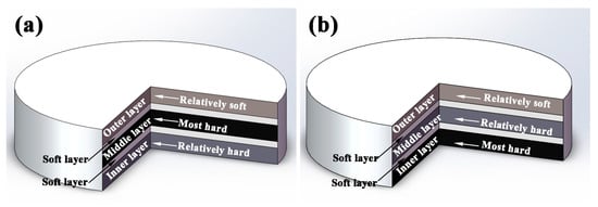 As two kinds of typical bionic models, the coupling effects between layered structure and the hard/soft combination model in Meretrix lusoria shell and Rapana venosa shell are simplified, respectively. Figure 2 shows the schematic diagrams of bionic coupling models inspired from Meretrix lusoria shell and Rapana venosa shell, which are composed of three hard layers including “Relatively soft layer”, “Relatively hard layer” and “Most hard layer” and two soft layers. According to the two microhardness distribution patterns of bionic models in Figure 1, the three hard layers are arranged in sequences of “Relatively soft”, “Most hard” and “Relatively hard” in Figure 2a as well as “Relatively soft”, “Relatively hard” and “Most hard” in Figure 2b from outer layer to inner layer, respectively. Soft layers space and connect contiguous two hard layers, establishing layered structure and the hard/soft combination model of bionic design. Bionic coupling models establish the connection between bionic design and bionic fabrication.