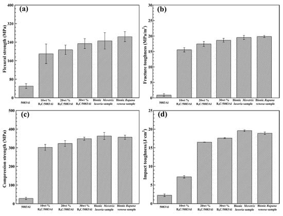 Flexural strength, fracture toughness, compression strength and impact toughness values of bionic layered composite materials are shown in Figure 6a–d, respectively. Flexure strength values of 5083Al, 10 wt % B4C/5083Al, 20 wt % B4C/5083Al and 30 wt % B4C/5083Al were 51.2, 191.0, 205.3 and 230.5 MPa, respectively. With the increase of B4C content, flexure strength of B4C/5083Al composites increased. The flexural strength values of bionic Meretrix lusoria sample and bionic Rapana venosa sample were 249.6 and 169.6 MPa, respectively, which were higher than that of Al matrix and homogeneous composites.