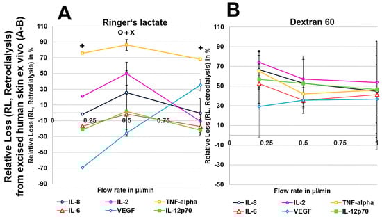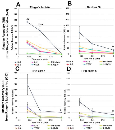 However, when colloid perfusates were used, the highest RLs and ALs were achieved at 0.5 µL/min for most cytokines and chemokines, except for VEGF. At this flow rate, HES 70/0.5 and dextran 60 showed higher ALs for IL-2, IL-6, IL-8, TNF-α, and IL-12p70 than Ringer’s lactate, in contrast to the HES 200/0.5 solution (Table 2).