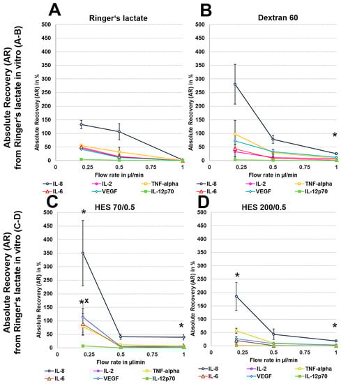 We first analysed the RR and AR from Ringer’s lactate, which is a surrounding solution without any macromolecules or oncotic pressure, in an in vitro model where the catheter was surrounded by fluid retained in a syringe using different perfusates. Microdialysis of the six mixed cytokines using Ringer’s lactate as the surrounding medium in vitro initially showed a significant decrease in the volume obtained with the crystalloid perfusate Ringer’s lactate, particularly at low flow rates of 0.2 and 0.5 µL/min, but a strong increase in all of the colloid perfusates over the expected volume of 50 µL was observed (Table 1). Colloid perfusates increased the dialysate volume at 0.2 µL/min by ~4 fold and at 0.5 and 1 µL/min by ~2 fold (Table 1). The ARs from Ringer’s lactate solution showed an overall significant increase, especially for the 8 kDa IL-8 (Figure 1A–D), when using colloid perfusates, such as dextran 60 HES 200/0.5 and HES 70/0.5. The in vitro ARs of cytokines and chemokines from Ringer’s lactate solution were negatively correlated with the molecular mass and flow rate, resulting in high ARs for the low-molecular-mass chemokine IL-8 and the cytokines IL-2, IL-6, and TNF-α at 0.2 µL/min. In contrast to the 35 kDa VEGF, where the AR was increased up to 113% with HES 70/0.5, the AR increase in the high-molecular-mass cytokine IL-12p70 (70 kDa) was lower and only modestly increased to 7% by the same colloid perfusate HES 70/0.5 (Figure 1A–D). In contrast, the RR (concentration recovery) for IL-8 was significantly higher when the crystalloid Ringer’s lactate was used as the perfusate in contrast to the colloid perfusates at 0.2 µL/min and 0.5 µL/min (Figure 1A).