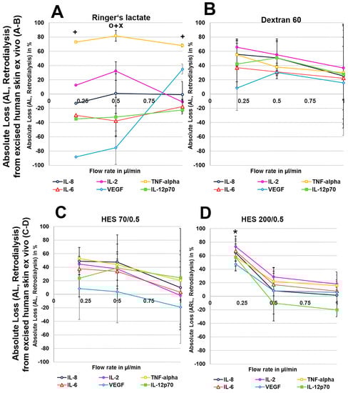 (A–H): Effect of different colloid perfusates (dextran 60 (B,F), hydroxyethyl starches (HES) 70/0.5 (C,G) and 200/0.5 (D,H) and the crystalloid Ringer’s lactate solution (A,E)) on absolute loss (AL) from excised human (A–D) and porcine skin (E–H) during retrodialysis and ex vivo experiments. Each figure represents the mean values with standard deviation of three independent experiments of all six different cytokines at flow rates of 0.2, 0.5, and 1 µL/min. Significance (p < 0.05) is indicated by *, x, o and +. * shows significant differences when compared with Ringer’s lactate, x shows significant differences compared with HES 200/0.5, + shows significant differences compared with HES 70/0.5, and o shows significant differences compared with dextran 60 solution.
