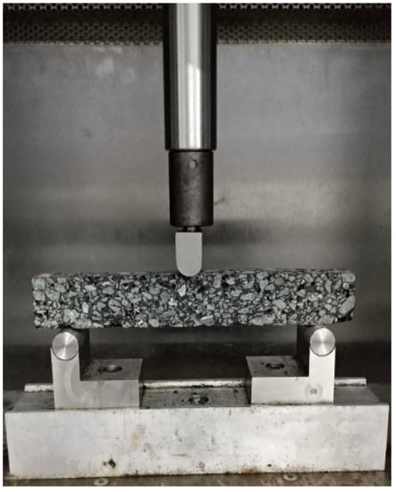 A three-points bending test is the common approach for evaluating low-temperature cracking performance of asphalt mixtures. The test device is shown in Figure 2. Beam specimens with 250 ± 2.0 mm length, 30 ± 2.0 mm width, and 35 ± 2.0 mm height were used []. There were five parallel specimens in each type of mixture. The test was carried out on a Universal Testing Machine (UTM)-25 from Melbourne, Australia, and the experimental parameters were −10 °C of temperature and a loading rate of 50 mm/min. The bending strain energy and bending strain energy density in this study were used to evaluate the four mixtures [], and formulas for the calculations were as follows: