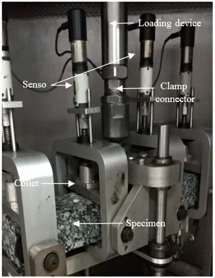 A four-points bending fatigue test was conducted by UTM-25 (IPC Global, Melbourne, Australia) as shown in Figure 3. The length, width, and height of the beam specimens were 380 ± 2.0 mm, 63.5 ± 2.0 mm, and 50 ± 2.0 mm, respectively. The test temperature was 15 °C. A haversine load pulse at 10 Hz was used. In the fatigue test, strain control loading mode was adopted to study the fatigue life of the asphalt mixture under a microstrain, such as 500 με, 600 με, 700 με, and 800 με.