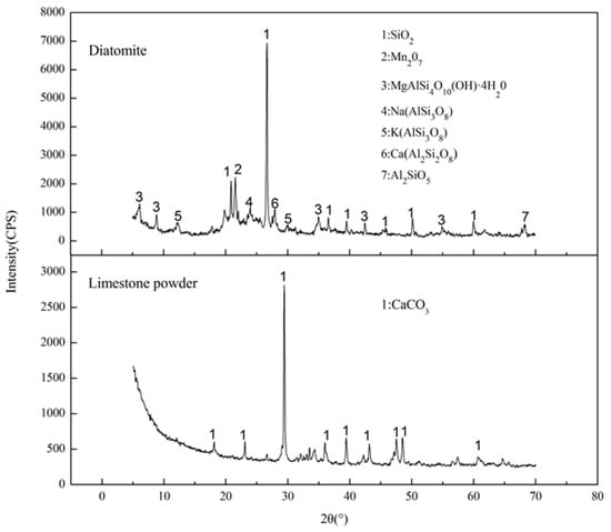 Figure 4 shows the XRD patterns of diatomite and limestone powder. A strong diffraction peak appears at 2θ = 26.66° in diatomite, which represents the mineral phase of SiO2. From the retrieved mineral composition, it can be concluded that the group OH− is contained in diatomite. It is an essential reason for the surface activity and absorptivity of diatomite []. For the XRD pattern for limestone, there is a very strong diffraction peak of CaCO3 at 2θ = 29.43°. It implies the extremely high content of CaCO3.